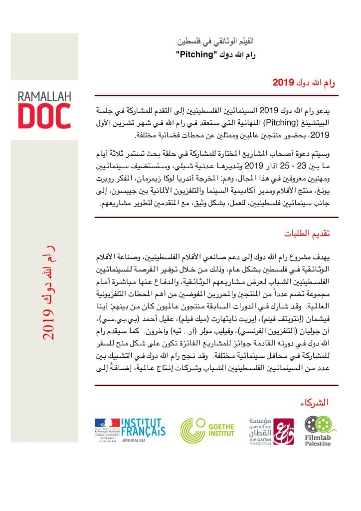 Ramallah Doc 2019 invite les cinéastes palestiniens à postuler pour la séance de pitching en présence de producteurs et de responsables de programme TV internationaux, qui se tiendra à Ramallah en octobre 2019.