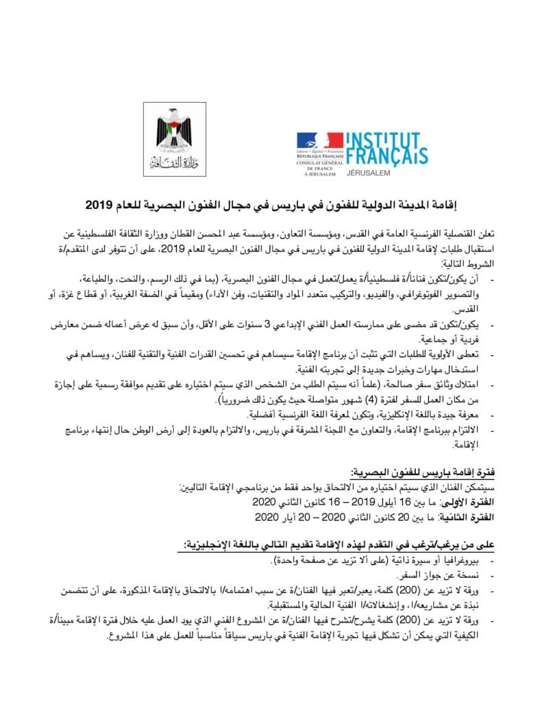 Cette résidence, réservée aux artistes visuels, est un projet mené en coopération avec la Qattan Foundation, Taawon, le Ministère de la culture palestinien et le Consulat général de France à Jérusalem.