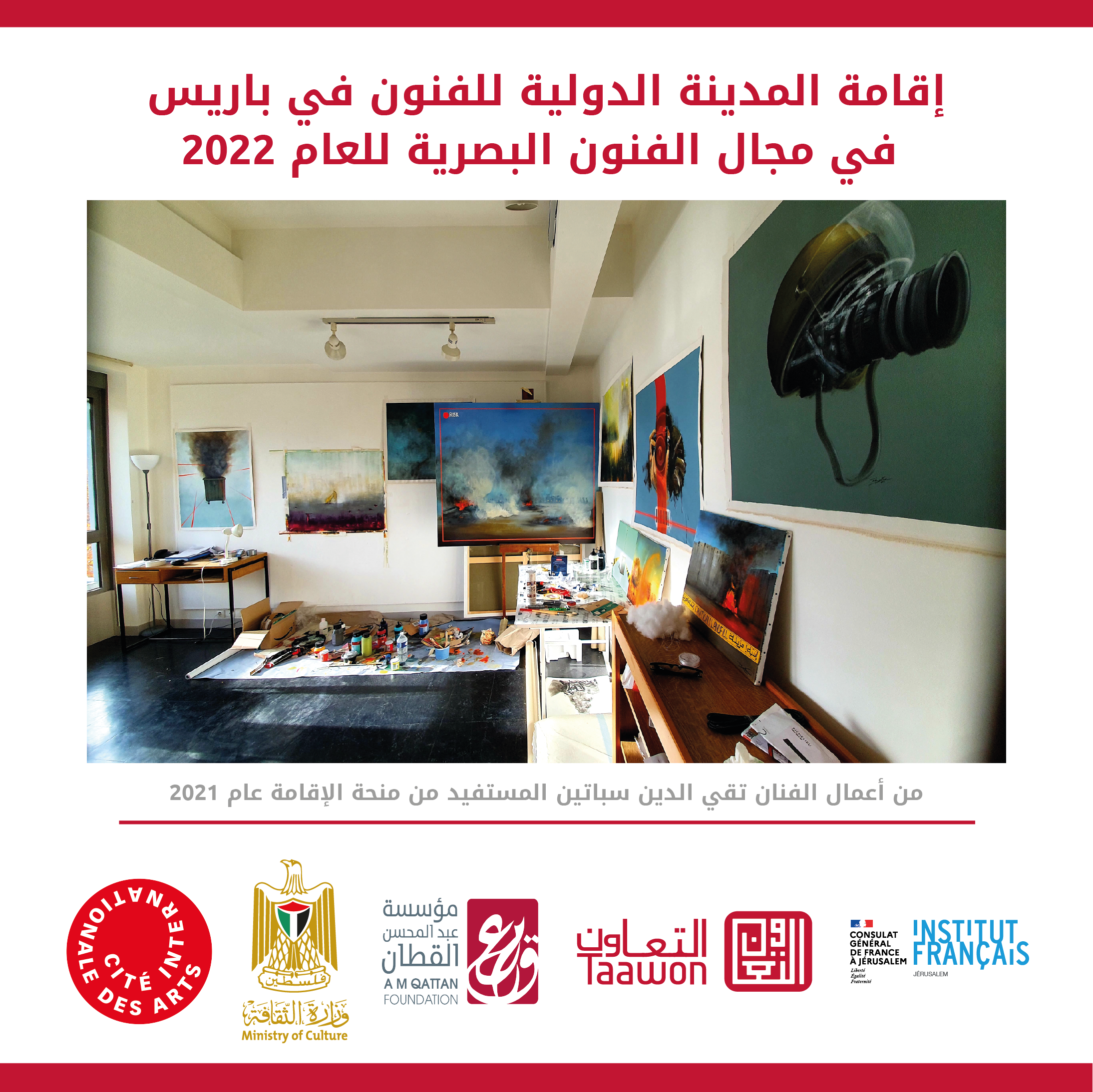 تعلن كل من مؤسسة “التعاون”، ومؤسسة عبد المحسن القطان، ووزارة الثقافة الفلسطينية والقنصلية الفرنسية العامة في القدس، عن استقبال الطلبات الخاصة بإقامة المدينة الدولية للفنون في باريس في مجال الفنون البصرية للعام 2022.