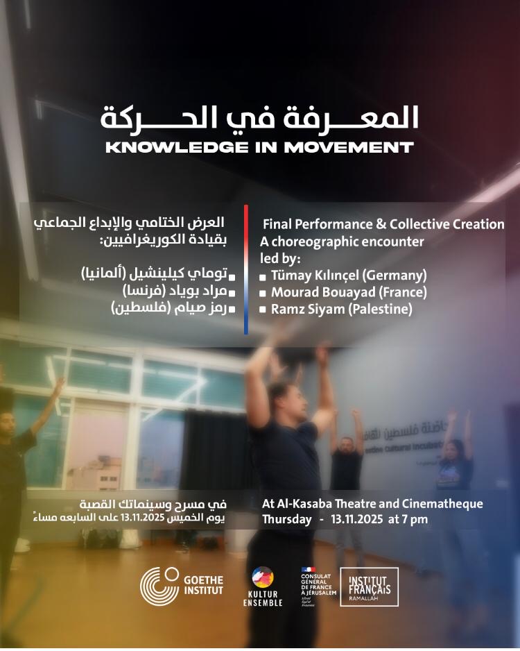 L’Institut culturel franco-allemand de Ramallah est heureux de présenter “Knowledge in Movement”, une expérience artistique et humaine inédite née de la rencontre entre trois danseurs professionnels – le Français Mourad Bouayab, l’Allemand Tümay Kilinçel et la Palestinienne Ramz Siyam– et de jeunes danseurs palestiniens.